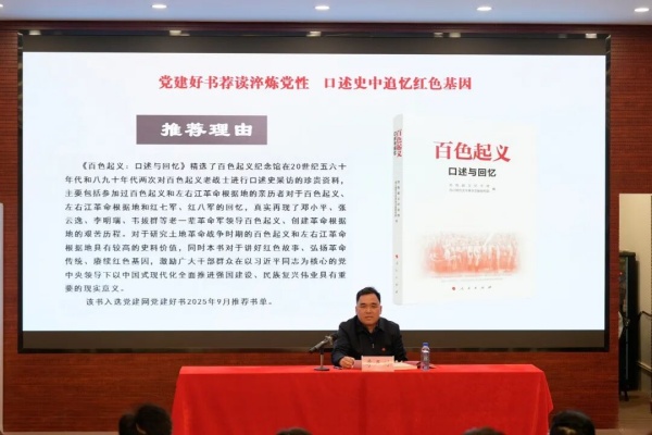 近日,百色起义纪念园管理中心党总支以“党建好书荐读淬炼党性,口述史中追忆红色基因”为主题,开展第四十六期读书分享会。党员干部在《百色起义:口述与回忆》字里行间...