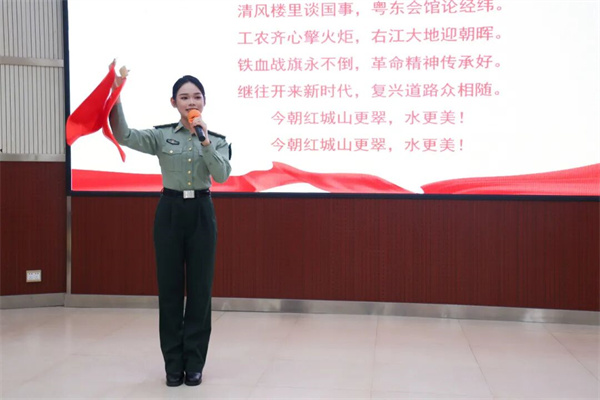 南昌八一起义纪念馆宣讲员黄海凤带来的沉浸式课堂《人民的军队 音乐国防课》结合音乐和视频,生动再现了人民军队无畏牺牲、英勇奋斗的革命事迹。当国歌旋律响起,全体师生起立齐声高唱,将课堂氛围推向了高潮,让同学们在庄严肃穆的仪式与激昂旋律中深刻感悟家国情怀,传承红色基因。