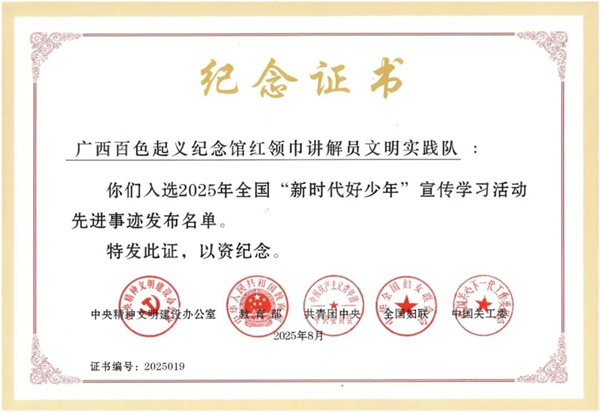 百色起义纪念馆红领巾讲解员文明实践队荣获“全国新时代好少年”称号