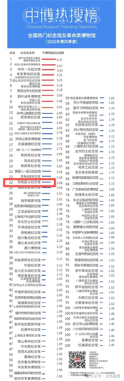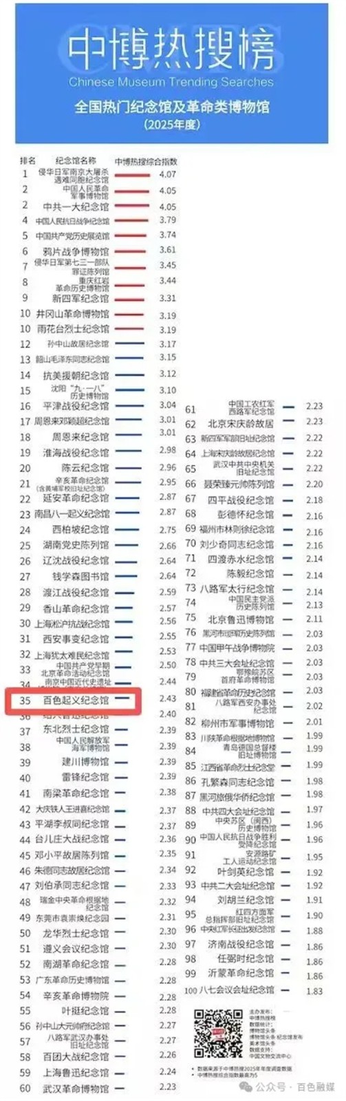 全国热门纪念馆百强榜由权威机构综合公众关注度、教育影响力、展陈创新性等多维度指标评出,竞争激烈。百色起义纪念馆排名的稳步提升,是近年来其系统性提升综合实力的集中体现。百色起义纪念馆坚持以“内容为王”,深度挖掘百色起义中民族团结、军民一心的独特历史价值,持续优化基本陈列,并积极引进国内优质革命历史专题展览,丰富了展陈的思想内涵与层次。