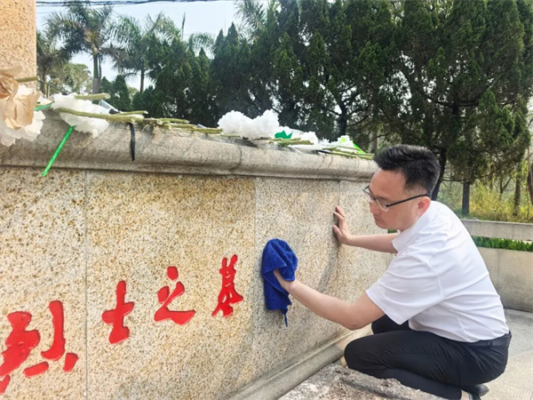 在七十八位外省籍烈士墓前,干部职工在管理中心党组书记、主任李正对的带领下,手持清洁工具,分工协作,或躬身擦拭墓碑,细细拂去碑上尘埃;或手持扫帚清扫台阶与周边路面,清理杂草杂物,用实际行动守护英烈安息之地。